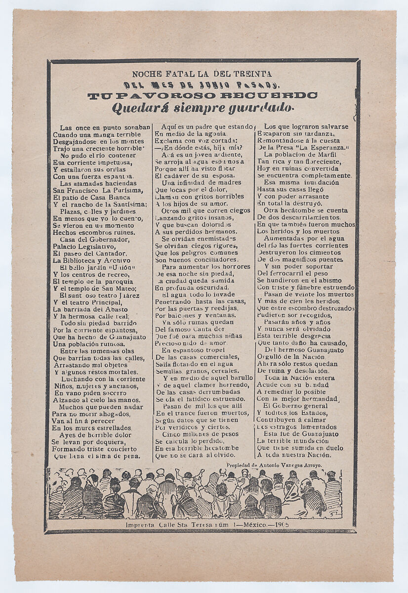 - Title: Broadsheet with victim accounts from a flood in Guanajuato, crowd of people waiving their hands and praying