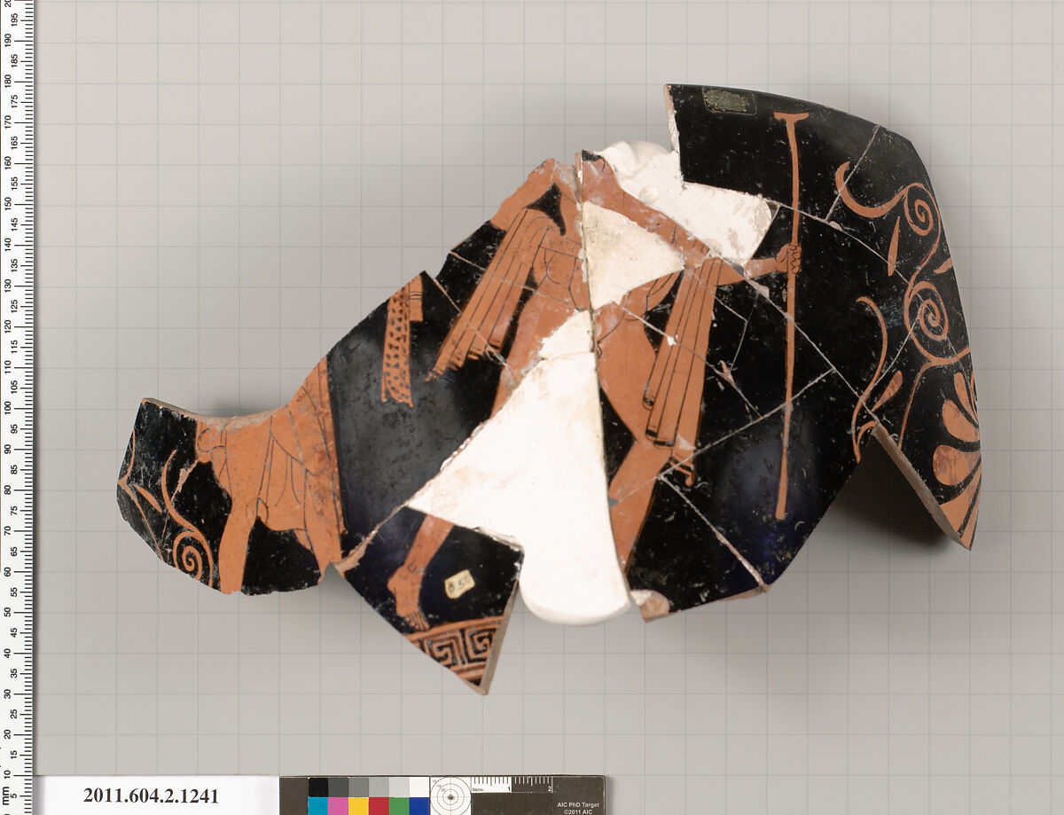 At the left, tendrils; legs and chlamys of a male to right; flute case and glottokomeion; male to right, with his himation draped over his forearms and around his back, holding a staff in his left hand; palmette and tendrils; below the figures, a meander pattern
