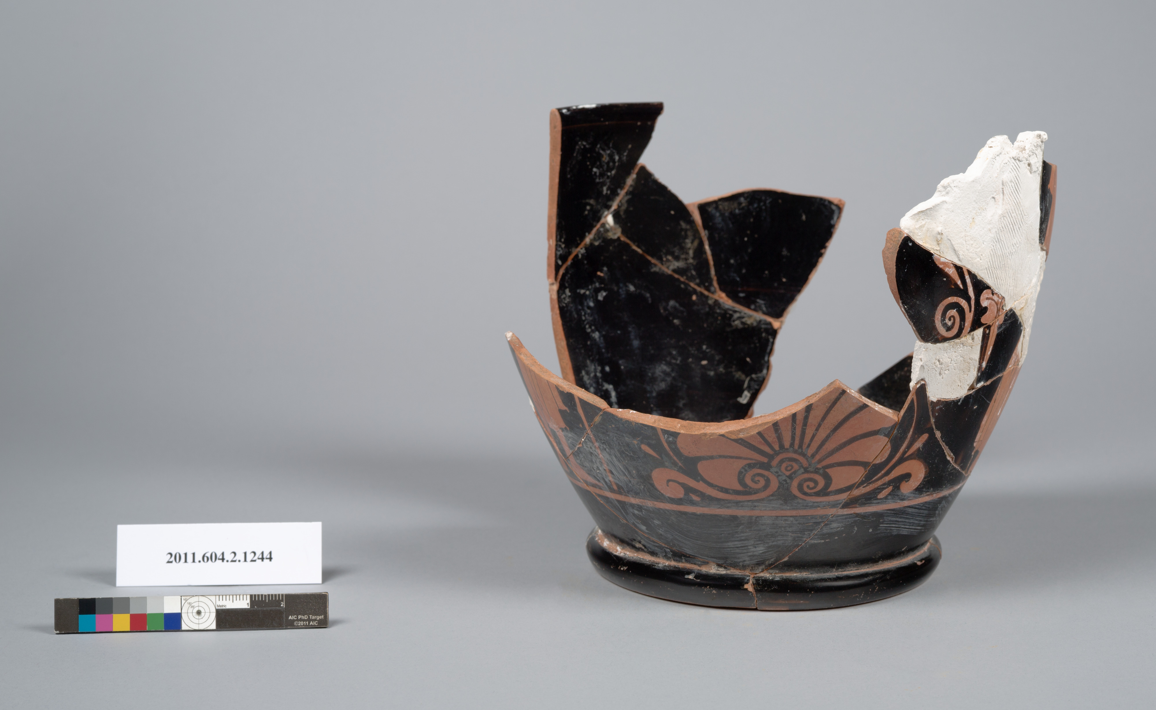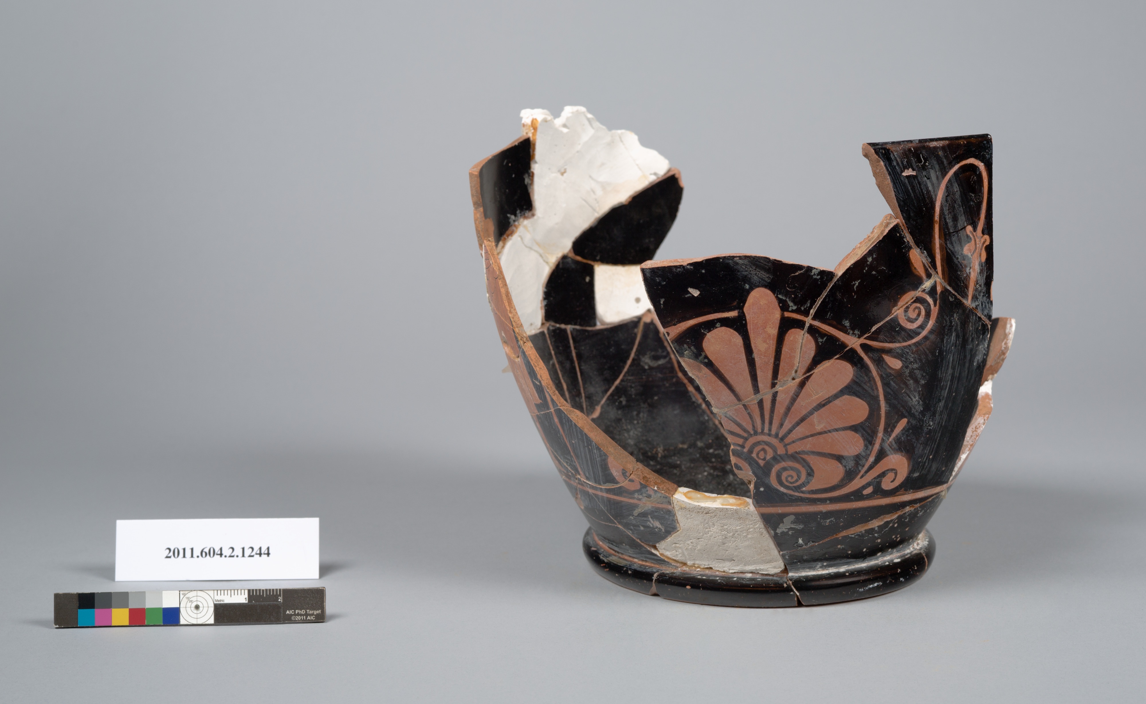 Obverse, legs and drapery of a youth to right; part of a draped youth with a knobby stick; Reverse, lower drapery and feet of a youth to right; lower drapery and feet of a youth with a knobby stick; in between the obverse and reverse, large circumscribed palmettes with tendrils and lotus buds; the outer edge of the foot is glazed; the resting surface of the foot is unglazed; the inner wall of the foot is glazed; the underside of the foot has miltos