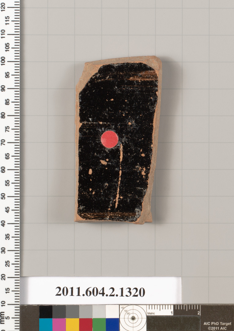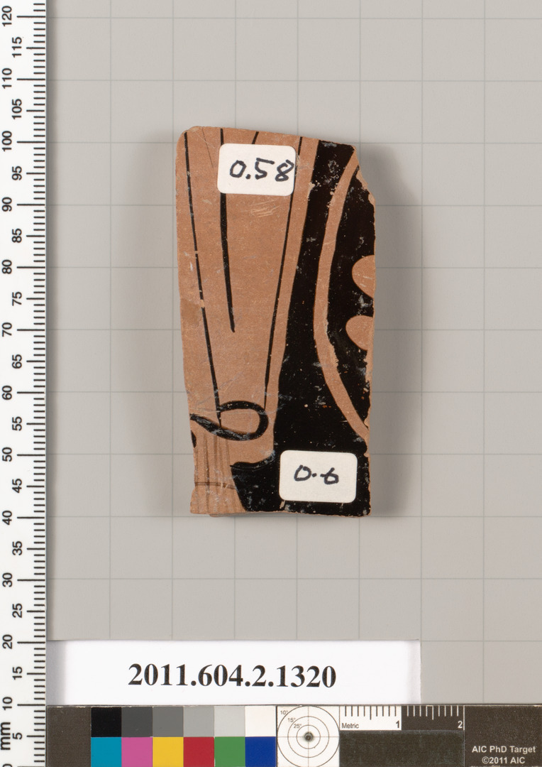 Lower body of a draped woman? wearing a chiton and himation; part of a circumscribed palmette