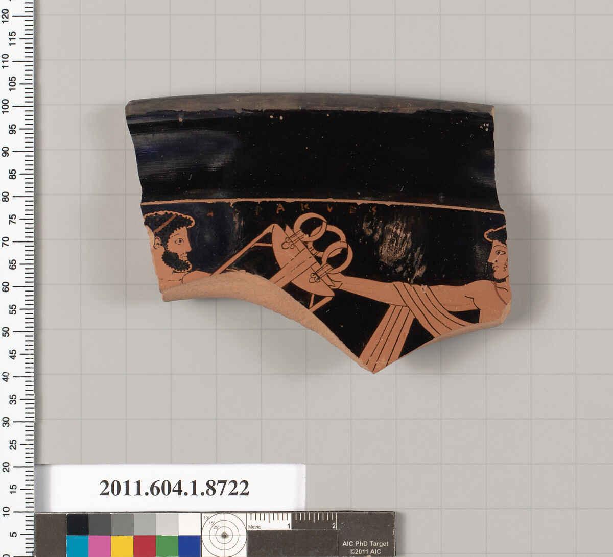 Head, neck, and left shoulder of a filleted Herakles to right; head, neck, right shoulder and extended right arm, with a himation draped over the elbow, of Apollo grasping the top of the tripod with his right hand; struggle for the Delphic Tripod; part of an inscription, HERAKLES