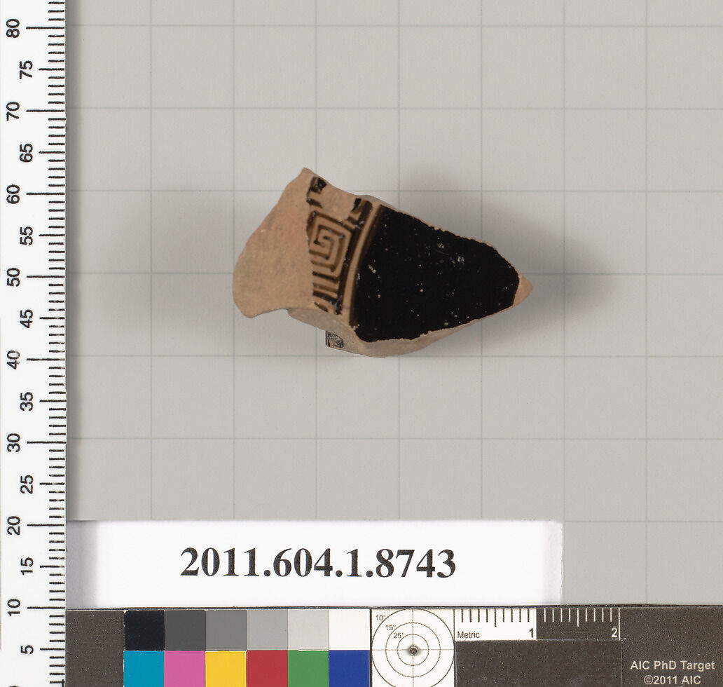 Interior, meander; Exterior, profiled ring foot, with a glazed outer edge; the resting surface is unglazed; the inner wall of the foot is glazed; the underside of the cup has a band of reserve on the outer edge; followed by a thick band of black glaze, a thin band of reserve, and a thin band of black glaze, and, an area of reserve in the center