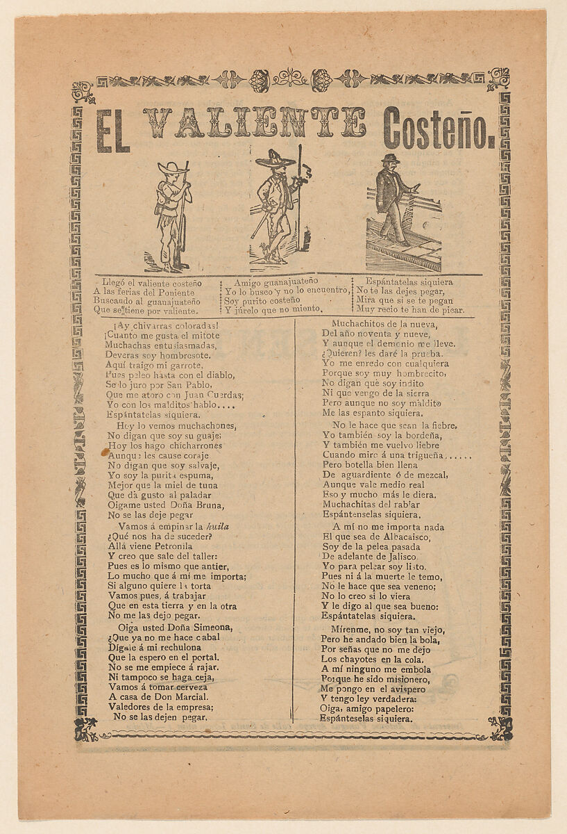- Title: Broadside about a brave man from the west coast of Mexico, who is shown walking down a street wearing a sombrero