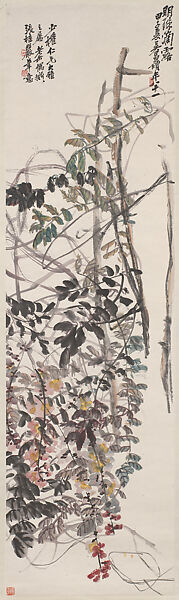 Flowering wisteria vines were a favorite subject of Wu Changshuo, who reveled in painting the wildly tangled vines and cascading bundles of blossoms. Wu was a leading figure of the nineteenth- and early twentieth-century Shanghai School of painting, which built on historical precedents to fashion a bold manner of bright colors and saturated applications of ink and pigment.