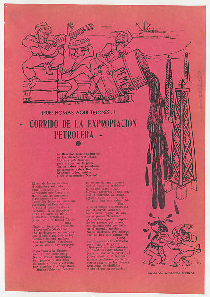 - Title: Broadsheet with a ballad about oil expropriation, figures standing on a landing and spilling a barrel of oil onto figures below