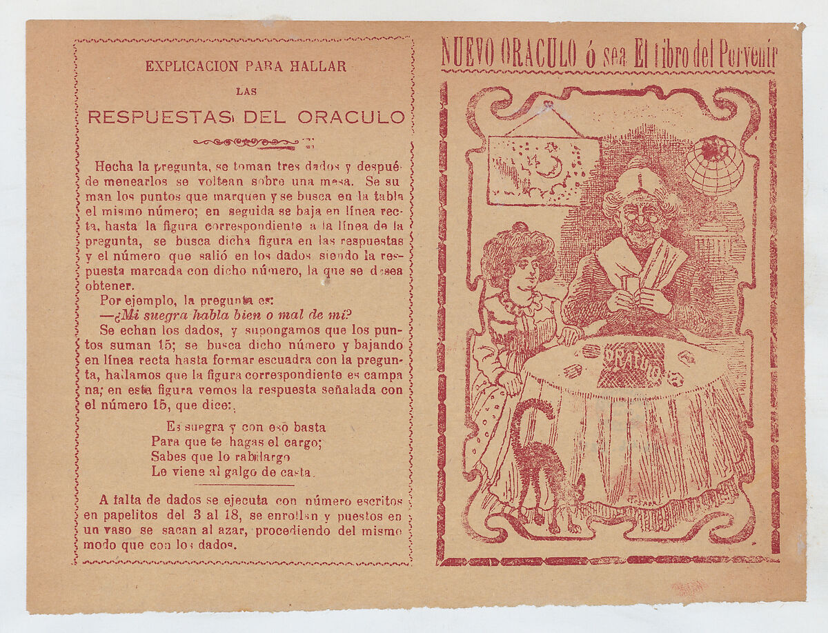 - Title: Cover for 'Nuevo Oraculo ó sea El Libro del Porvenír', an old women seated at a table and reading someone's fortune from cards