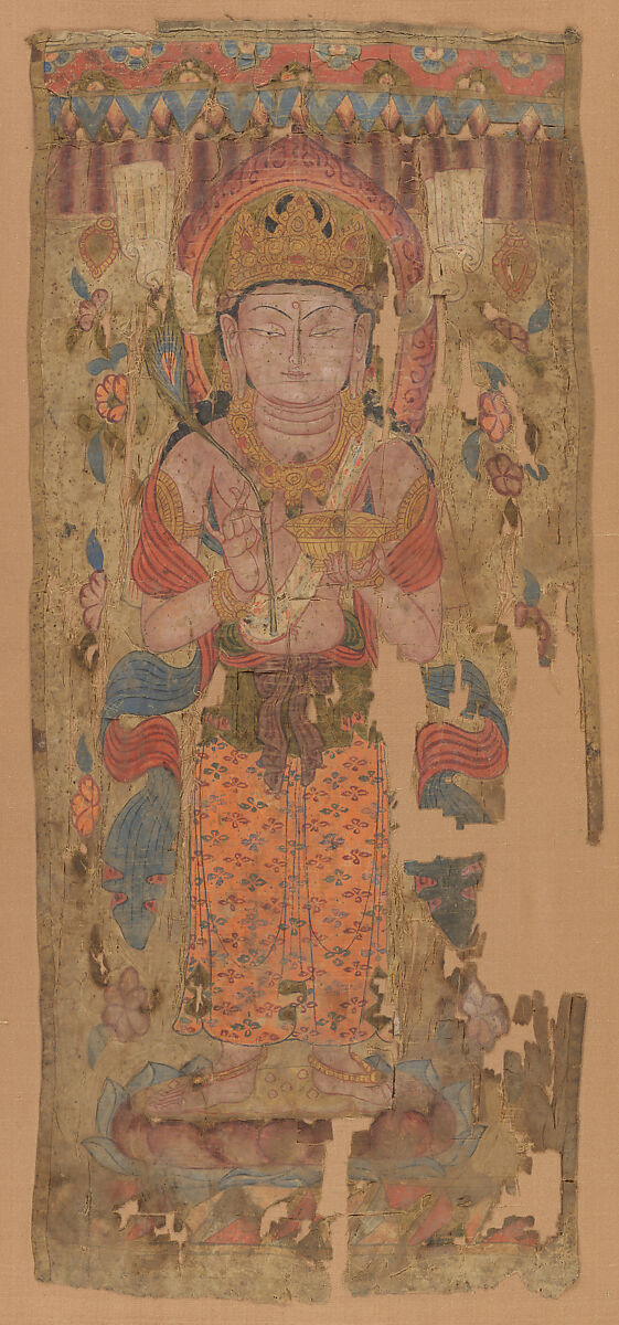 This colorful banner from the renowned Buddhist cave temples near Dunhuang is an important example of early Chinese Buddhist painting. It consists of two parts that may or may not have matched each other originally. The smaller triangular piece features a Buddha seated on a lotus flower in a meditative posture. A bodhisattva standing on a lotus pedestal, richly decorated with precious accessories, fills the scroll.