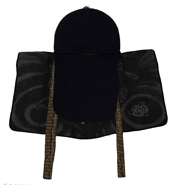 Traditional Japanese houses were made of wood, bamboo, and paper, and in crowded cities like the capital Edo (present day Tokyo), the houses were built with little or no space in between which made them prone to fires. Over the centuries Edo was ravaged by a series of great and devastating fires. The citizens called the fires “Edo no hana” or “flowers of Edo,” most of which broke out during the dry winter season when people heated their homes with charcoal. Edo (1615–1868) and Meiji (1868–1912) period Japanese firefighters were equipped with heavy, multi-layer indigo-dyed cotton (sashiko) jackets (hanten), sock-like footwear, gloves, trousers, and hats, such as this work, for their protection. The outfit was soaked in water before the firemen started their mission. The garments are typically decorated with mythical beings, heroes, or dragons, with symbols connected to water and bravery. Here, the part of the cap covering the top of the head is ornamented with a cloud-like motif, while the back flap bears the auspicious and dramatic design of clouds and a dragon—both symbols of water and rain.