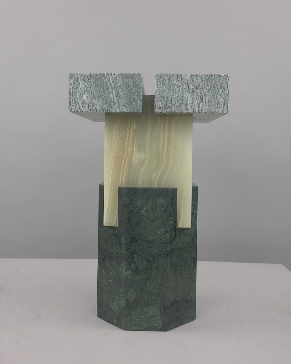 Featuring some of the same natural materials used by ancient Romans to build classical monumental structures, Ionik Stool, together with Dorik Stool (MMA 2018.507) and Tuskan Stool (MMA 2018.509), is reminiscent of antique stone capitals and uses a formal and proportional vocabulary drawing from that of the classical architectural orders. Totemic in form, this stool projects an abstract geometric modernism in place of the elaborate carvings of the columns that inspired it. Rather than supporting a building, this stool is meant to be used within a domestic setting, as seating or a side table. The Chroma Edition of all three stools was designed as a special edition for The Met’s 2017 exhibition Ettore Sottsass: Design Radical, a variation on the previous edition commercially available. The coordinated primary color schemes of each object derive from the palettes used by Ettore Sottsass in his work from the mid to late twentieth-century.