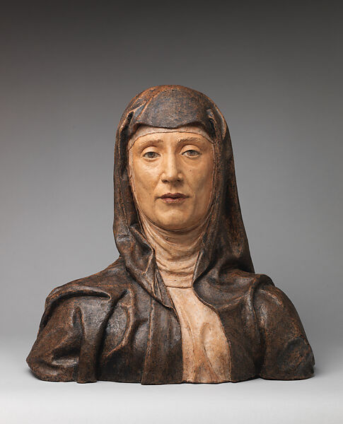 In this psychologically penetrating work, Niccolò dell’Arca, great pioneer of realistic terracotta sculpture in North Italy, has made us believe we are encountering the fifth-century saint, Santa Giuliana de’ Banzi. To do so, he may have based her features on a contemporary woman of Bologna, where she was particularly revered and where Niccolo settled in the early 1460s. But it is much more than a likeness. By giving her slightly parted lips and eyes that seem to track her melancholy thoughts, this wealthy, pious widow comes alive before our eyes.