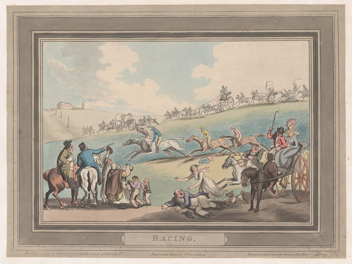 Spectators seated in carriages, on horseback, and on foot, line a course to watch a horse race--the stout rider scattering figures at right is not a racer but a spectator whose mount runs out of control. The print comes from a group by Rowlandson devoted to moments in horse racing--interestingly none shows a finish. When first published around 1789, the titles were "The Mount," "The Start," "The Betting Post," and "The Course." The present example comes from an expanded reissue of 1798-99 with titles altered to "Mounting" (59.533.1697), "Racing" (59.533.1694), "Betting" (59.533.1695), with "Between Heats" (59.533.514, 59.533.1700), and "Weighing" (59.533.1696) and "Running out of the Course" (59.533.1698) added.