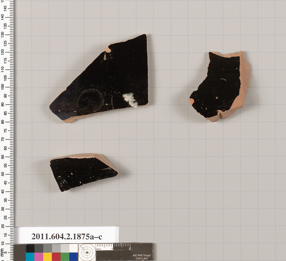 Three black glaze fragments from skyphoi; one fragment is sheared