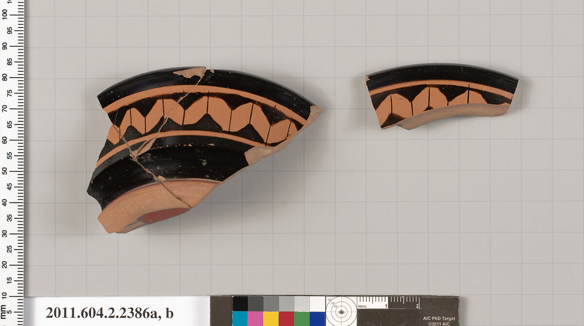 Two fragments from a Nicosthenic pyxis with a ribbon in between two lines of reserve