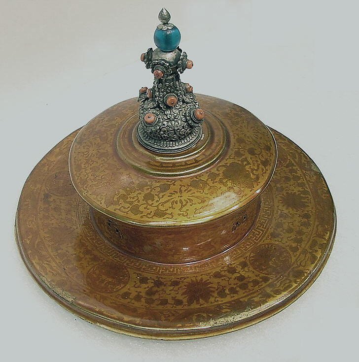 - Medium: Lacquer with finial of silver, coral and blue glass
