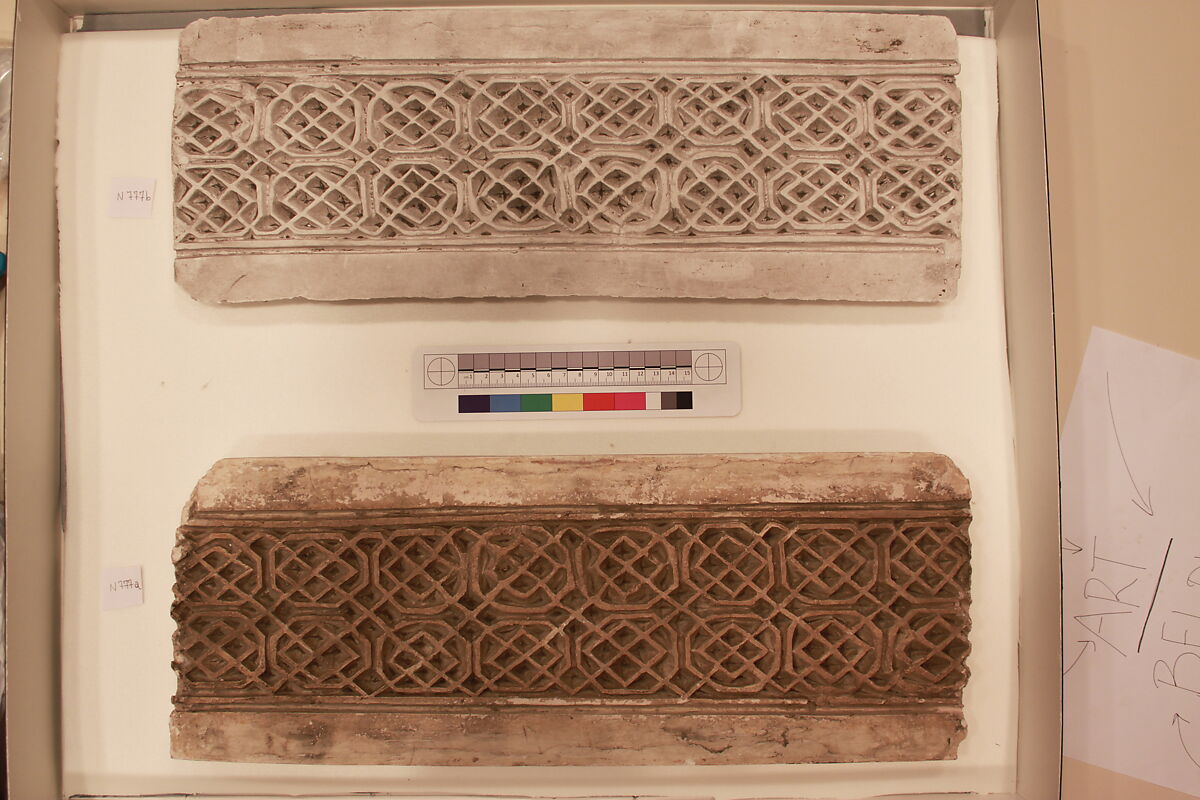 As part of the larger "Persian Expedition" project at Nishapur, American archaeologists and hundreds of Iranian workers excavated a mound named Tepe Madrasa. There, they uncovered an architectural complex which they tentatively associated with a palace or governmental center because of the solidity of the built structures and the extent and variety of wall decorations (including carved and painted brickwork, glazed tiles, wall paintings, and carved and painted stuccoes). This, together with the ceramic and metal finds, aided in attributing the site to the ninth or tenth century onwards. A mosque, refurbished multiple times up to the late eleventh century, was also unearthed, yielding the remains of a monumental entrance with a large terracotta inscription bearing the titles of a sultan (39.40.58, .60–64). Several twelfth century tombstones were also unearthed, showing the shift in purpose of what was earlier a residential area.