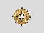 Embellished with gold beads and inset with bezel-set stones, referencing Byzantine medieval jewelry from the Musée Cluny, Paris, this heavily hammered gold brooch was made by the modernist jeweler Ed Wiener. Wiener’s career started in the 1940s in the bohemian hot bed of Greenwich Village, where he produced hand-hammered silver jewelry alongside other artists such as Sam Kramer and Art Smith. Although his early jewelry found formal inspiration in Alexander Calder, as he progressed, Wiener evolved his own vocabulary, often shaped by his interest in adopting new materials and techniques in casting, setting, and joining. By the late 1960s–80s, he was on Madison Avenue, adopting a post-modern aesthetic in which he revived medieval gold settings with semi-precious stones, historical references including pre-Columbian forms, and semiotic play. This brooch is part of a collection of twelve pieces donated by Wiener’s daughter which show the development his own language of modernist forms.