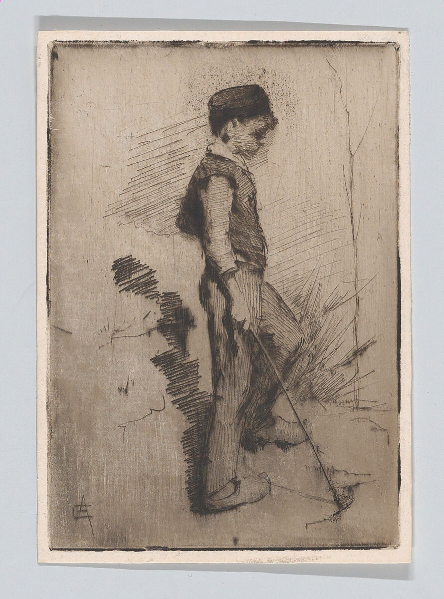 Born in Canada, Forbes studied in New York, Munich, Zandevoort, and Brittany before settling in London in 1883. There she joined the Society of Painter-Etchers and produced more than forty drypoints over six years. After marrying fellow artist Stanhope Forbes in 1889, she moved to Cornwall and focused on painting, since she could no longer rely on the services of an expert printer. A 1922 article states that Forbes, “expressed herself in drypoints of such consummate delicacy and sensitiveness, yet of so much beauty, that they are in a class apart, in no way to be identified with the work of any other artist.” This meditative image of a Breton boy wearing sabots expresses Forbes's interest in local subjects and success at portraying children.
