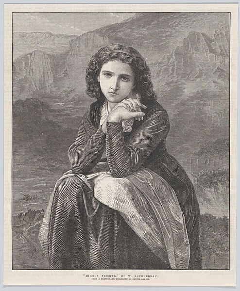In 1866, Bouguereau signed an exclusive contract with Goupil & Cie for both the sale of all his paintings and their reproduction rights. This print and its title derives from Goupil’s photograph of an 1869 painting, Mignon, which depicts the title character from an opera of the same name, based on Goethe’s Wilhelm Meister. The painting sold to a private collector in The Hague within a month of arriving at the Goupil Gallery in Paris, but its image circulated far beyond through the photograph and its reproduction, such as this wood engraving that appeared on the cover of the Illustrated London News. Bouguereau earned his reputation as one of the most successful nineteenth-century French academic painters in large part thanks to the circulation of his work in this manner, especially in the U.S. and U.K.