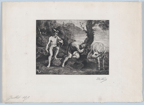 This etching after Rubens’s "Mercury, Argus and Io" (1635–38) is one of eight prints Waltner made as illustrations for the exhibition catalogue of Belgian collector John W. Wilson (1815–1883), who exhibited his collection of old master and contemporary British and French paintings in Brussels in 1873. The catalogue describes, in addition to the version illustrated, three known iterations of this subject by Rubens, which he adapted from Ovid’s Metamorphoses. Io, whom Jupiter has turned into a cow to avoid the jealousy of Juno, stands at right. Argus, assigned to guard her, has fallen asleep against a tree at center to the music of Mercury’s pipe. Mercury, sent by Jupiter to kill Argus out of guilt over Io’s misery, plays his pipe with one hand while drawing his sword with the other. Waltner, a celebrated reproductive printmaker and winner of Prix de Rome for engraving in 1868, would have produced this signed proof for collectors in Paris eager to acquire early impressions of contemporary etchings.