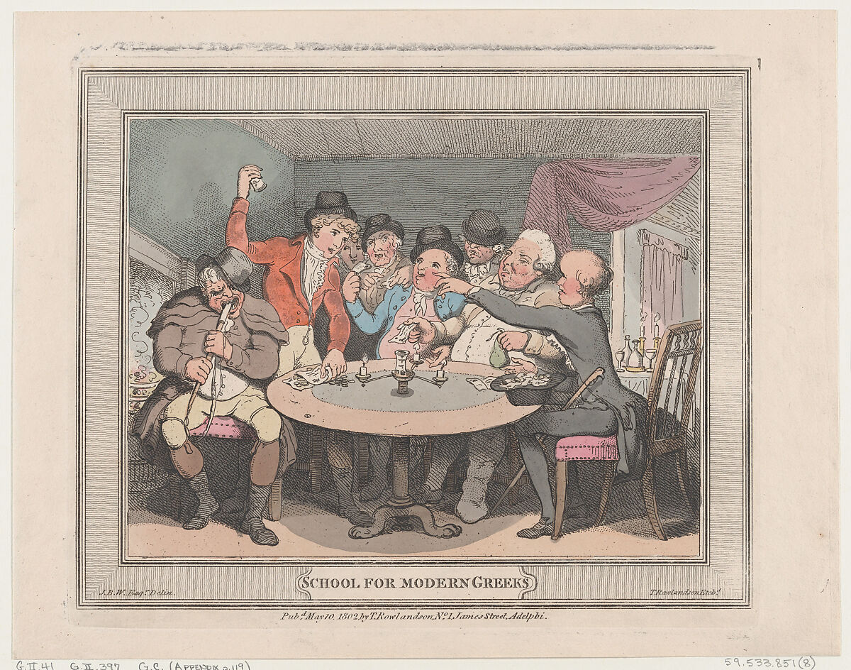 In this seventh print of a group of eight, a young man raises a dice cup and prepares to throw. The title makes it clear that his success relies on cheating or "greeking," the accusatory gesture of the older man across the table a sign that he has been discovered. A coachman gnawing his whip at left seems ready to wreak revenge. Rowlandson etched this set after drawings by Willyams, a university-educated lieutenant-colonel from Cornwall who also supplied supporting satirical text under the pseudonym Joel McCringer. Rowlandson's characteristic elegance does not disguise the dark human impulses being satirized. Modern education, it is suggested, does little to teach self-control, wisdom or empathy.