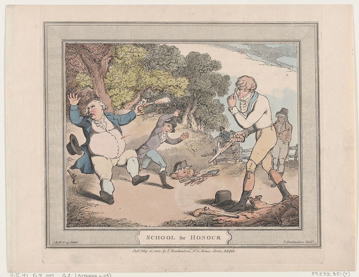 In this sixth print of a group of eight, a young dandy duels in the countryside, looking through his monocle to see whether he hit his target. At left, a older man falls backward after being shot, near a doctor who shelters below a bank with implements at the ready. Rowlandson etched this set after drawings by Willyams, a university-educated lieutenant-colonel from Cornwall who also supplied supporting satirical text under the pseudonym Joel McCringer. Rowlandson's characteristic elegance does not disguise the dark human impulses being satirized. Modern education, it is suggested, does little to teach self-control, wisdom or empathy.