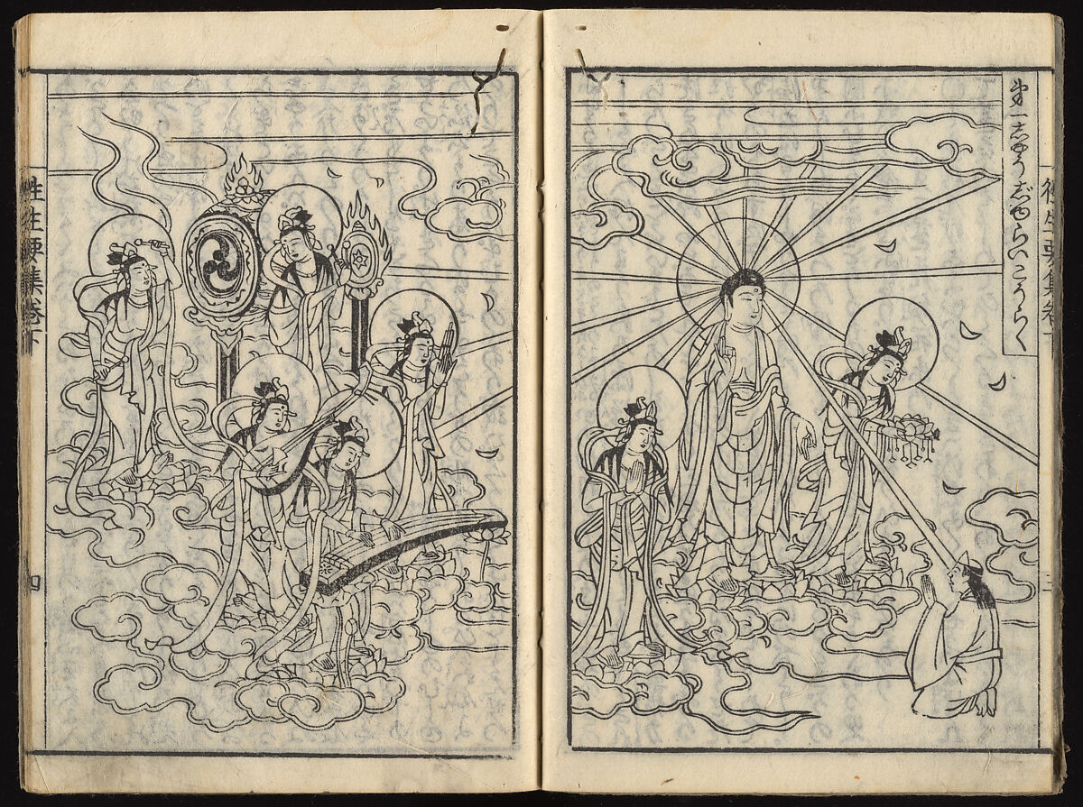 This set of illustrated books reproduces a medieval text known as the Ojōyōshū, written by the Buddhist monk Genshin (942–1017) in the late 900s. Genshin’s treatise includes startling descriptions of the various hells into which a sinner could be reborn and explains Pure Land practices that ensured rebirth in paradise. One powerful technique, nenbutsu, involves the visualization or recitation of Amida’s name. The monk’s teachings exerted major influence on later followers of Amida and Pure Land Buddhism.