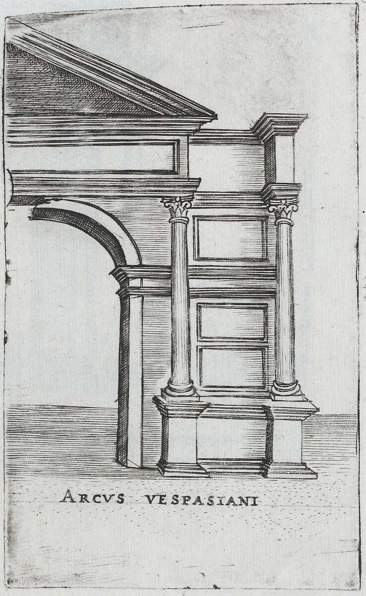 The print is part of a group of architectural prints depicting buildings from Roman Antiquity, ranging from triumphal arches to bath houses, temples and palaces in Italy, France and Spain. Some of the buildings have been artificially reconstructed based on Medieval descriptions, while others are depicted in their ruinous states. The plates are known in several (uncatalogued) states, and have undergone minor changes over time. Several titles of buildings have been changed, and the plates have been cropped as a result of plate cracks and oxidation.