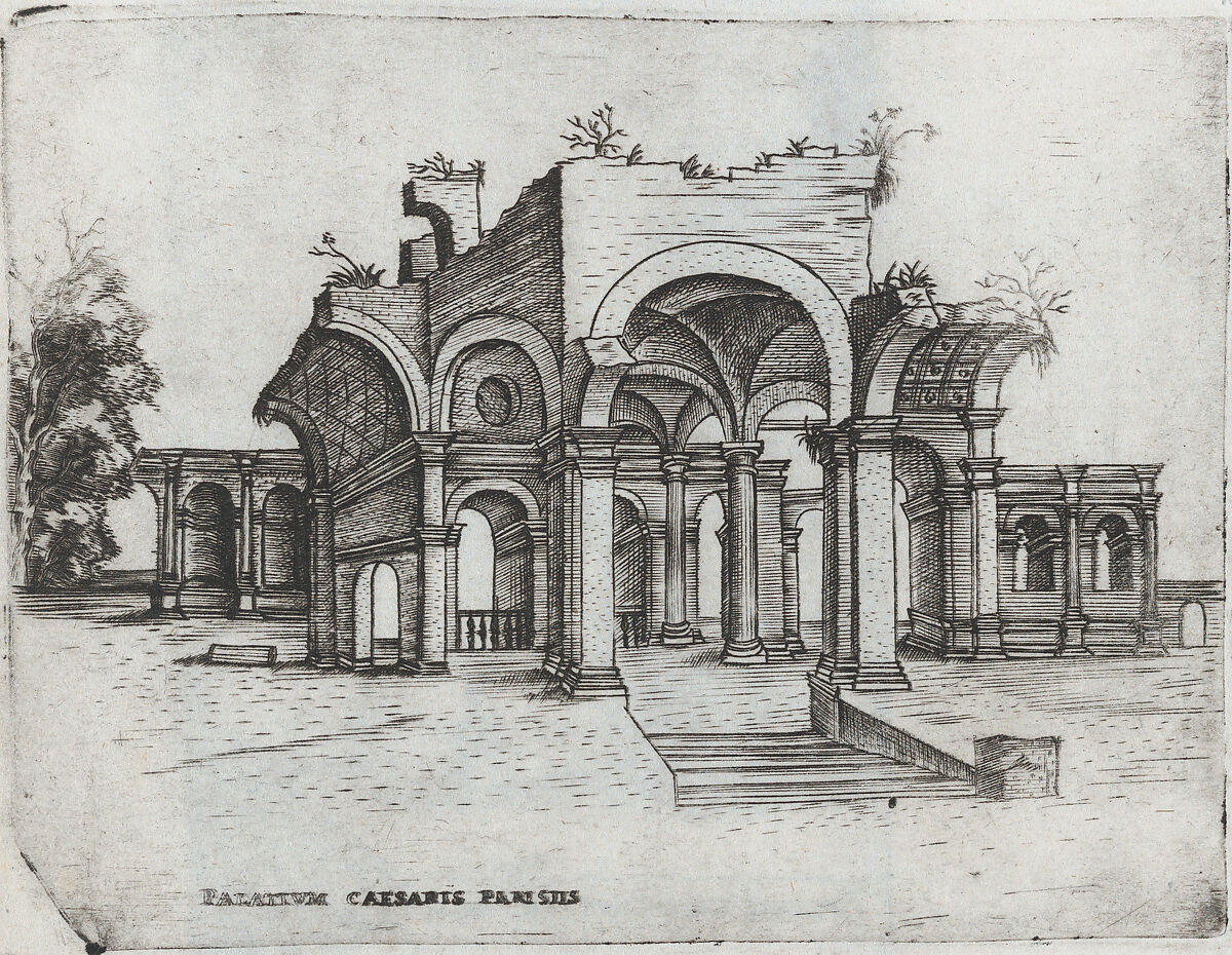 The print is part of a group of architectural prints depicting buildings from Roman Antiquity, ranging from triumphal arches to bath houses, temples and palaces in Italy, France and Spain. Some of the buildings have been artificially reconstructed based on Medieval descriptions, while others are depicted in their ruinous states. The plates are known in several (uncatalogued) states, and have undergone minor changes over time. Several titles of buildings have been changed, and the plates have been cropped as a result of plate cracks and oxidation.