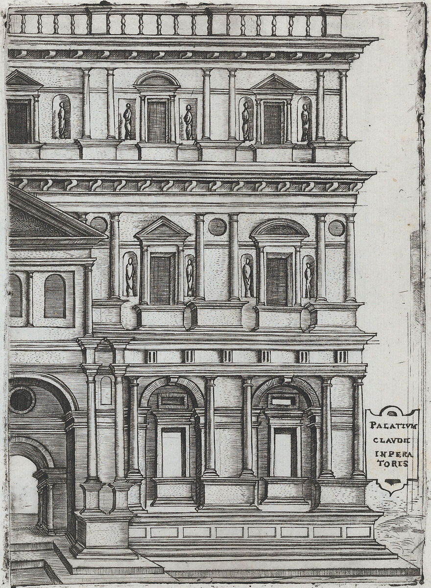 Perspectival depiction of the side view of a building referred to as the ‘Aerarii Publici Rome’, the public treasury of Rome. The main body of the building is circular in shape interrupted at regular intervals by semi-circular absidioles and an avant-corps on the front side (here seen on the left). The avant-corpse consists of a monumental staircase that leads up to the fourth floor of the building. A separate staircase leads to the top of the building, which is crowned by a dome with a balustrade. While the building is meant to represent the public treasury of Rome, thought to have been located on the Capitoline Hill near the Temple of Saturnus, very few architectural elements remain to indicate what the building may have looked like, and this rendition was likely created as an ekphrasis.