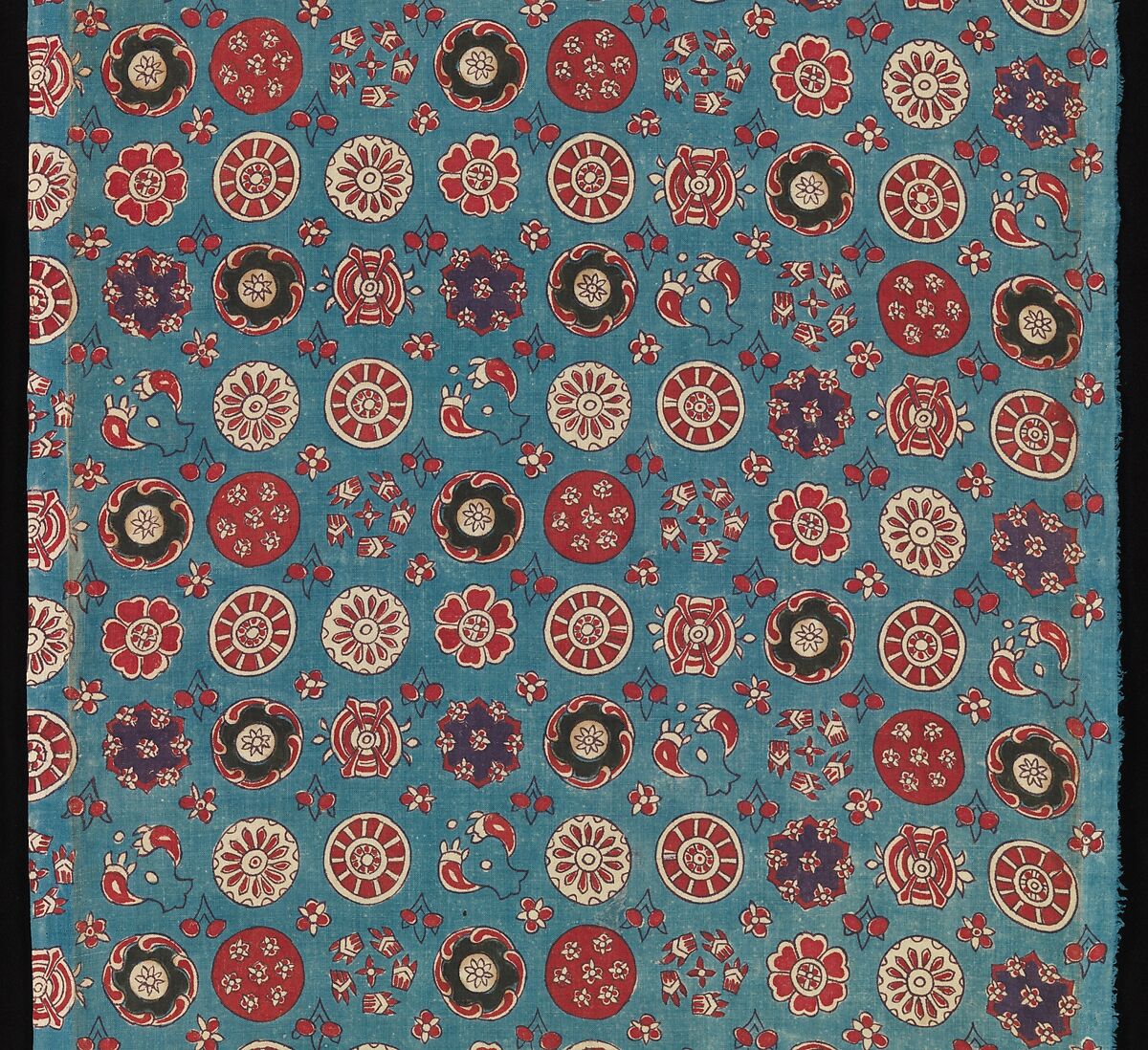 The exceptional length of this cloth—more than seven feet—suggests its possible use as part of a waistband (obi). Indian sarasa was particularly popular in the Edo period (1615–1868) for obi and robe (kosode) linings. Although the fabric was made in India, the repeating pattern of regularly spaced rosettes and roundels was based on Japanese sources. The motifs evoke Japanese Buddhist iconography—the lotus and the wheel—as well as the traditional chrysanthemum. This type of design is present in late eighteenth-century Japanese sarasa manuals published in Edo and Kyoto. These manuals, with color directives that encouraged Japanese textile printers to copy the Indian designs, confirm that sarasa were widely circulated even before such publications appeared.