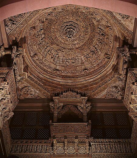 The carved wooden dome, balconies and supports of this architectural ensemble belonged to the gudha-mandapa (meeting and prayer hall) of the Vadi Parshvanatha Jain temple in Patan, Gujarat. The temple was dedicated on May 13, 1596. During the renovation and enlargement of the temple in the early twentieth century, this portion of the building was discarded; nothing of the original structure survives in Patan. Some of its elements—in particular, the eight large figures of musicians and dancers that rose toward the dome—were lost and are known only from early photographs. The figures carved around the dome are the ashtakikpalas (eight regents of the directions). Traces of pigment suggest that the interior of the structure was once painted.