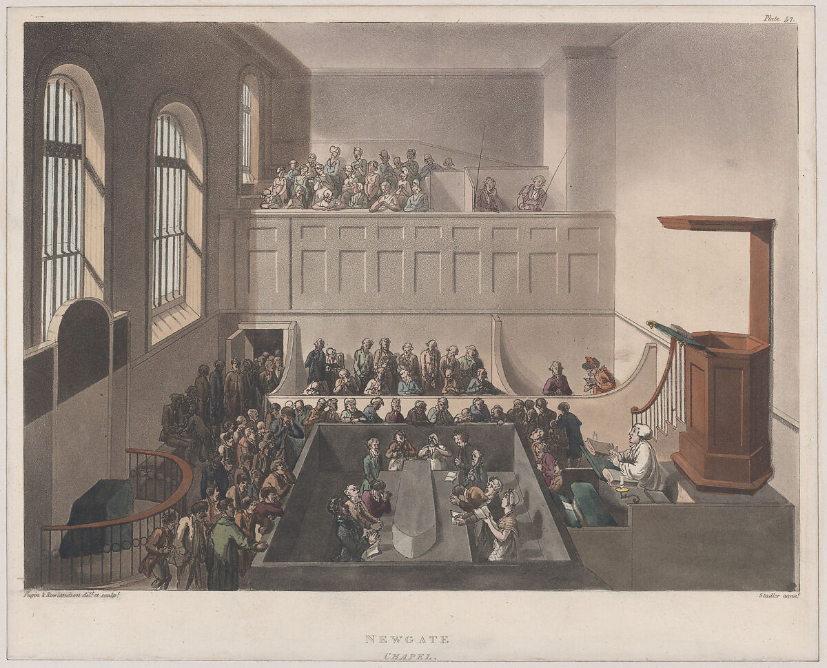 Operating under the jurisdiction of the City of London, Newgate Prison stood next to the Old Bailey courthouse and was built just outside the former city wall. Designed by George Dance, the forbidding prison opened in 1778 and was demolished in 1902. In addition to housing debtors, it served as a holding pen for those awaiting trial, and for condemned prisoners. This view of the chapel records how, on the Sunday before a hanging, condemned prisoners would sit around a coffin to listen to their last sermon. They did not need the tipstaffs, sitting upstairs, to keep them awake.
