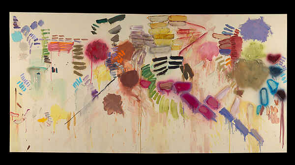 Smashed Strokes Hope belongs to Joan Snyder’s breakthrough series of abstract paintings, sometimes referred to as "stroke paintings" because of the way they emphasize the primacy of the artist’s brushwork. Distinct areas of paint seem to have been sprayed on, smeared on haphazardly (perhaps with a hand or a cloth), or applied carefully to create vertical and horizontal clusters. Prominent drips, smears, and stains appear throughout the canvas. In this riot of color, there is a palpable tension between regularity and irregularity, pattern and chaos, control and spontaneity. Snyder once said, "I wanted to tell a story and I wanted there to be different sections. I wanted a beginning, middle, and end, many different parts, happy, sad, tragic parts, many things happening at once, different instruments, different sounds, rhythms."