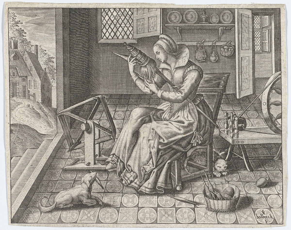 First plate of a group of 9 plates with small domestic scenes, engraved by Jan van Haelbeeck, which were either were made for, or reused by Jean Leclerc around 1615 in the sonnet series ‘Enigmes Joyeuses pour les Bons Esprits’, in which they were each published with a sonnet that hinted at the double meaning of the activities. In this plate, a woman dressed in 17th-century style, sits on a wooden chair, spinning wool. She is inside a room with tiled floors, open windows and doors, with some shelves with plates and baskets with fruits, in front of an open stair. Finished rolls of wool are in a basket near her, and a cat and a dog play with spare rolls around her. The plate accompanies the first sonnet of the Enigmes, which hints to the double, slightly erotic, meanings of the images. The double meanings of the images and sonnets of the Enigmes helps explain why most copies of the series, although very popular and influential in their day, have been lost.