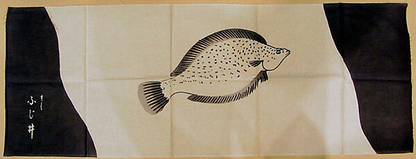 - Title: Towel (tenugui) with Pattern of Fish in Shades of Gray on White with Inscription in White on Gray