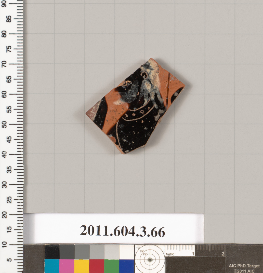 Old man to left, wearing a patterned garment; to the right of the old man, part of a figure?; to the left of the old man, part of a spear?