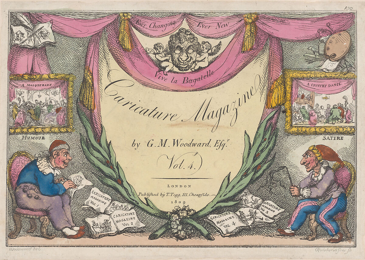 Tegg's "Caricature Magazine" first appeared in 1807 and each issue was given a different title page. This example introduced volume 4 in 1809; it would be put to use again in 1821 with a revised date and different hand coloring (see 59.533.1716). Two figures below may represent the artist Woodward and Tegg, with the man at left sketching a caricature and sitting below a framed image of a Masquerade and the word Humour; that at right holding a whip and sitting beneath a picture of a Country Dance and the word Satire. Laurels frame the title and publication details, with the latter topped with a swag lettered "Vive la Bagatelle," and a mask, here light-skinned, held by cupids. Text further above reads "Ever Changing" and "Ever New."