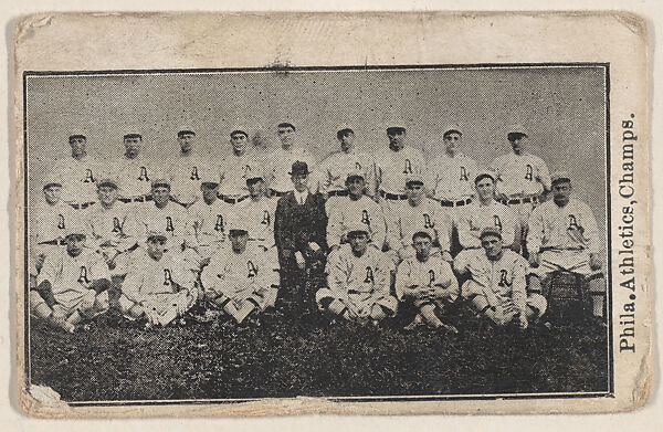 Team portrait of 1915 Philadelphia Athletics Champions from the Baseball Players set (W500), issued in 1915. Front: black and white photo of team. Back is blank. Unnumbered set.