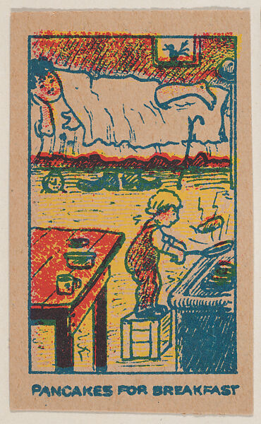 "Pancakes for Breakfast" trade card from the Charlie Chaplin series (W539). Front: commercial color lithography reproducing drawings. Back is blank. Unknown number of cards in set.