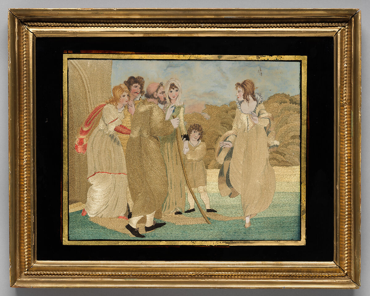 Susanna Rowson’s Academy, active from 1797-1822, was one of the most important and well-known girls’ schools of the early nineteenth century. The needlework pictures made at her school are notable for their fine quality embroidery and for the wide range of design sources from literature and history used there. Mrs. Rowson believed in providing her students with engraved prints, that she also used to teach lessons. In this case, in 1806, in addition to completing the needlework picture depicting the poem "The Friar of Orders Gray", Narcissa Sewall (1791-1886) also wrote the entire poem, in impeccably beautiful handwriting, on the paper that backs the needlework’s frame. She was probably required to memorize and recite it as well. The poem is from a popular volume of ballads published in 1765 by Thomas Percy (1729-1811) called Reliques of Ancient English Poetry: Consisting of Old Heroic Ballads, Songs, and other Pieces of our earlier Poets, which helped re-introduce the ballad verse form.