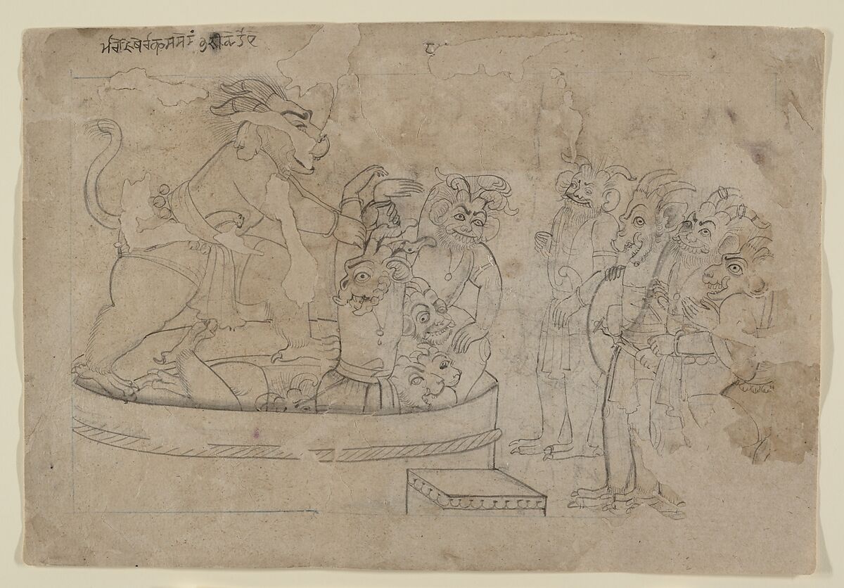 An inscription above the principal demon tells us "This is where Mara brings the demons to life." The master Manaku produced an extensive series of Ramayana paintings that are populated with closely related demons. If this drawing was not actually executed by the artist Manaku, it almost certainly was produced by his workshop.
