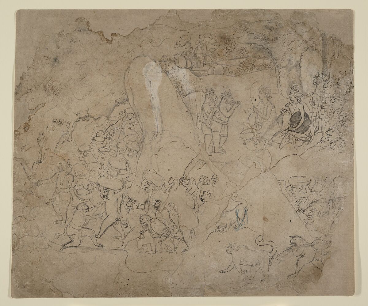 The monkey army is shown constructing a bridge to Lanka so that Sita can be rescued from the evil Ravana. Above, the monkey king Sugriva and his general Hanuman consult with Rama and Lakshmana, who sit in a nearby forest. Typical of late eighteenth-century Kangra painters, the artist devoted great attention to descriptive details and dramatized the composition by the use of the jutting rock formation that intercepts the composition diagonally, energizing the whole.