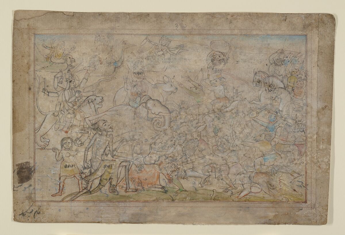 The epic battle between the forces of the goddess Durga and those of a hoard of asuras, or demons, illustrates the power and varied forms of Devi. Centrally placed on the left is Durga on her lion; below, the emaciated Chamunda (Durga's terrifying aspect) advances. Surrounding them are female manifestations of the Hindu pantheon, the Matrikas; flying above are Vaishnavi on Garuda, Kaumari on a peacock, and Brahmani on a swan, while Indrani rides on an elephant and Maheswari on a bull.