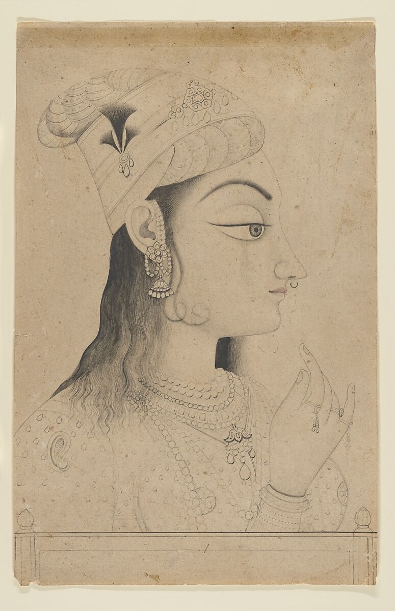 This woman of the Kishangarh court is dressed as Radha, Krishna's lover. The elongated head and stylized eye are typical of a figural type that emerged in the Kishangarh court in the late eighteenth century. This drawing is the pendant to 2008.359.27.