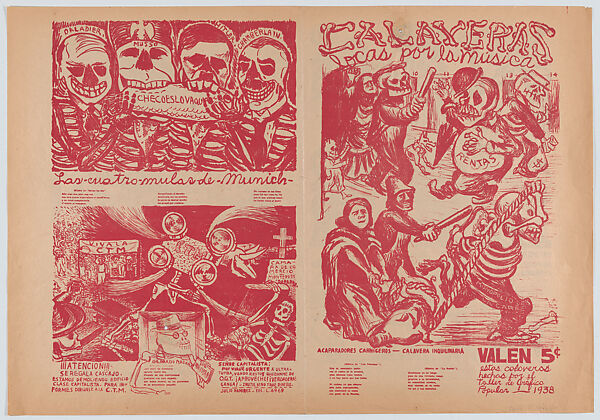 Aquí pueden verse la portada (derecha) y la contraportada (izquierda) de Calaveras, un periódico de cuatro páginas de temática política editado por el TGP entre 1938 y 1965. El uso de calaveras para abordar temas de actualidad sigue la tradición popularizada en las décadas anteriores por José Guadalupe Posada. En el lado derecho, las figuras se apoderan de las rentas de una familia y arrastran a un cerdo, dos representaciones del sufrimiento de la clase trabajadora mexicana causado por la inflación durante la década de 1930. La escena de la parte superior izquierda se ocupa de la política internacional. En una caricatura de los Acuerdos de Múnich de 1938 que otorgaron el control de los territorios checoslovacos a Alemania, Benito Mussolini y Adolf Hitler engullen un mapa de la región mientras los líderes de Francia y Gran Bretaña que firmaron el acuerdo, sentados junto a ellos, sonríen.