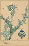 Plate, part of a collection of 30 pochoir pattern plates, originally part of a book titled "Les fleurs et leurs applications décoratives" (Flowers and their decorative applications), created by Émile-Allain Séguy and published in Paris by A. Calavas, as part of the collection "Librairie des Arts Decoratifs" (Library of Decorative Arts) in 1902. The plate features a naturalistic illustration with a thin, long branch, outlined with black and colored with shades of green and white outlines, flanked by long, spikey leaves, also outlined with black and colored with shades of green, and ending with a thistle flower, its receptacle colored with shades of green and with white highlights, and the petals colored with blue and white. A thistle flower bud, executed with the same colors, is placed on the lower right side of the sheet. The detailed, naturalistic depiction of this illustration reveals Séguy's unique interest in the scientific study of the creations of nature, including flowers, butterflies, and insects, as a source of inspiration for artistic creation. This illustration was likely meant to inspire designs for textiles and wallpapers.