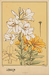 Plate, part of a collection of 30 pochoir pattern plates, originally part of a book titled "Les fleurs et leurs applications décoratives" (Flowers and their decorative applications), created by Émile-Allain Séguy and published in Paris by A. Calavas, as part of the collection "Librairie des Arts Decoratifs" (Library of Decorative Arts) in 1902. The plate features a naturalistic illustration with a bundle of lilies, outlined with thin, brown lines, the petals colored with white or with shades of orange, the pistils with green, and the anthers with brown, standing on thin, long branches, flanked by leaves, outlined with thin, brown lines, and colored with shades of green. On the right part of the sheet is a detail of the pistil of the flower, outlined with brown and colored with shades of green. On the lower left corner of the sheet is a view of a lily from above, outlined with brown. The detailed, naturalistic depiction of this illustration reveals Séguy's unique interest in the scientific study of the creations of nature, including flowers, butterflies, and insects, as a source of inspiration for artistic creation. This illustration was likely meant to inspire designs for textiles and wallpapers.