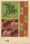 Plate, part of a collection of 30 pochoir pattern plates, originally part of a book titled "Les fleurs et leurs applications décoratives" (Flowers and their decorative applications), created by Émile-Allain Séguy and published in Paris by A. Calavas, as part of the collection "Librairie des Arts Decoratifs" (Library of Decorative Arts) in 1902. The plate features three ornamental designs inspired on the natural beauty of umbels, providing what Séguy considered a successful example of the application of scientific study of flowers in artistic creation, resulting in colorful designs likely intended for textiles or wallpapers. The first design is made up of a bundle with stylized leaves, colored with dark green, and bundles of semi-abstract umbels, colored with two shades of pastel green, enclosed by a thin square, outlined with dark green, over a green ground. The second design is made up of thin, interlacing branches, alternatingly colored with red and with bundles of semi-abstract leaves, and colored with white and with bundles of semi-abstract umbels colored with blue and orange, over a green ground. The third design is made up of thin, interlacing branches, colored with blue and outlined with golden brown, with bundles of semi-abstract pink flowers, and stylized leaves, colored with red and dark blue, over a light brown ground.