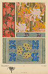 Plate, part of a collection of 30 pochoir pattern plates, originally part of a book titled "Les fleurs et leurs applications décoratives" (Flowers and their decorative applications), created by Émile-Allain Séguy and published in Paris by A. Calavas, as part of the collection "Librairie des Arts Decoratifs" (Library of Decorative Arts) in 1902. The plate features four ornamental designs inspired on the natural beauty of chrysamthemums, providing what Séguy considered a successful example of the application of scientific study of flowers in artistic creation, resulting in colorful designs likely intended for textiles or wallpapers. The first design is made up of thin, interlacing branches with leaves, colored with dark green, and semi-abstract chrysanthemums, colored with pink, over a red ground. The second design is made up of thin, vertical branches with leaves, colored with yellow and outlined with green, and stylized chrysanthemums, colored with shades of purple, over a green ground. The third design is made up of thin, undulating branches with semi-abstract chrysanthemums, colored with purple, surrounded by semi-abstract leaves, colored with grayish-blue, over a light bluish-green ground. The fourth design, likely for a rug, is made up of three bundles of stylized chrysanthemums with yellow petals and black pistils, liked by thin, interlacing branches with leaves, colored with dark green, framed by thin, interlacing branches with large, stylized leaves, colored with blue, over a green ground with semi-abstract leaves.