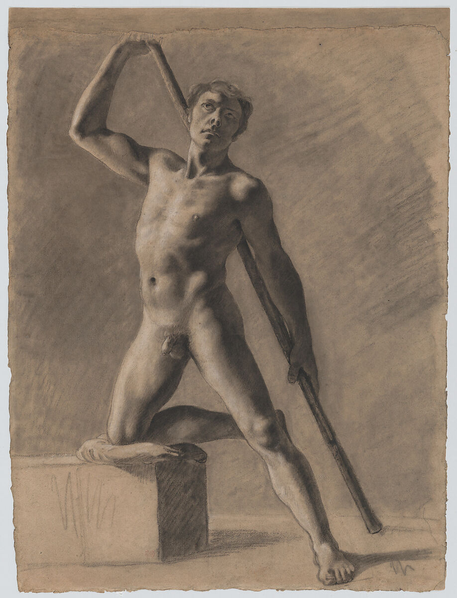 The "académie," or drawing from a live model, served as the foundation of artistic instruction both in private studios such as Guérin’s and at the Ecole des Beaux-Arts. This rare example by Delacroix shows the young artist’s attempt to absorb the dominant manner of rendering the body taught at that time, through careful, subtle modeling. Before long, however, he abandoned the prevailing neoclassical theory that emphasized ideal beauty and contour, adopting a more expressive, individual approach.